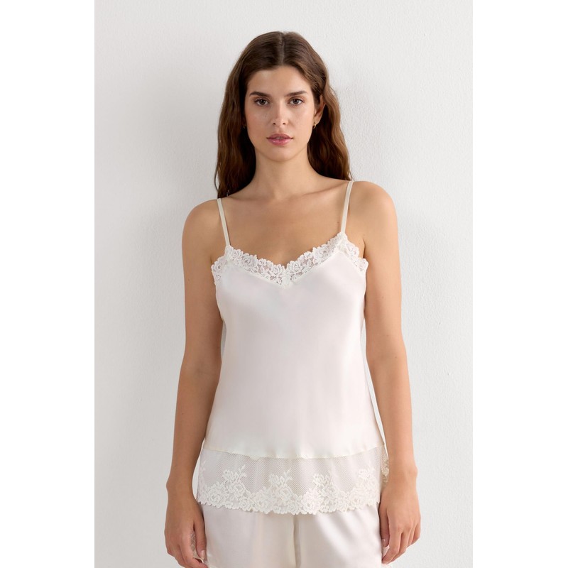 - Silk satin tank top with a front and back V-neck embellished with lace inserts at the neckline and hem