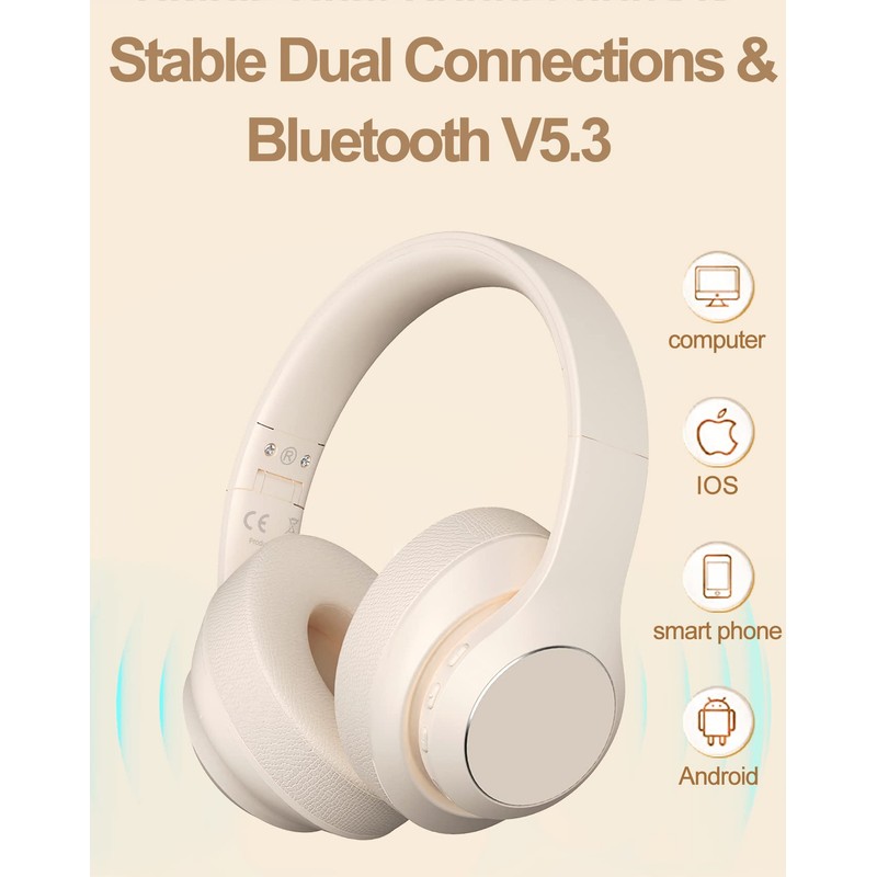 Intoberp Wireless Bluetooth Headphones Over Ear, 40 Hours Playtime Wireless Light Weight Headset with HiFi Stereo Sound for Travel Work (Beige