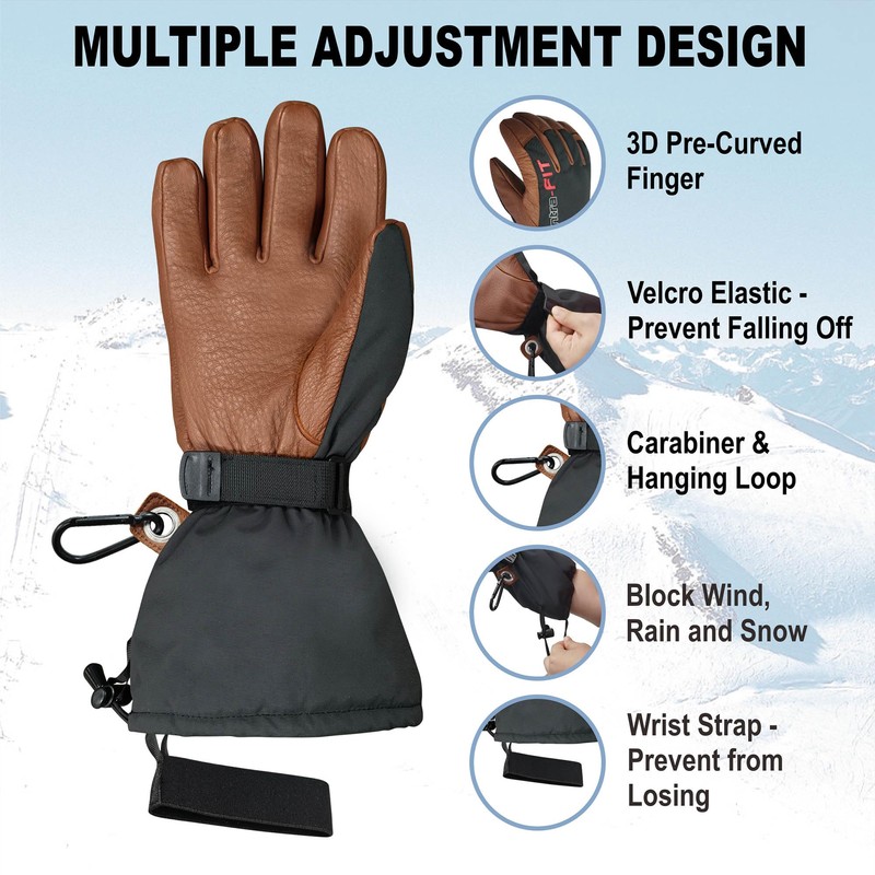 - Waterproof and Windproof: These ski gloves feature a deerskin palm, durable Oxford cloth back and cuff, and an inserted TPU membrane for reliable protection against cold, wind, and moisture. A wrist pull-tab further helps keep snow, rain, and wind out, ensuring your hands stay dry and warm