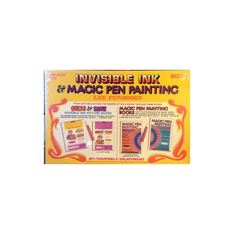 1982 Lee Publications; Louisville, KY....Contains: Guess & Show Invisible Ink Picture Books where the orange guess & show pen instantly reveals the invisibly printed pictures. Also includes Magic Pen Painting Books - paint the pictures with the magic purple pen and see the rainbow of colors appear ...like magic before your eyes. Multi color - no mess - no water...a new and easy way to paint. Pens included (due to age of kit; pens may not be top quality).