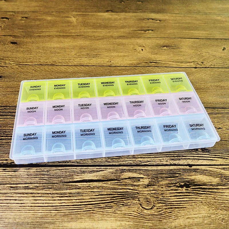 Pill Box has 21 separate compartments to hold the pills or tablets for each day of the week.