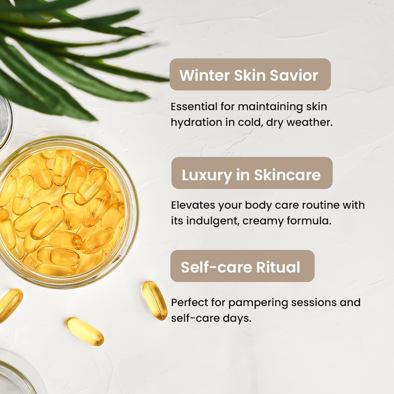 •  Enhanced with Hyaluronic Acid: Infused with Hyaluronic Acid, this body butter locks in moisture, helping to maintain the skin's hydration levels and reduce the appearance of fine lines and wrinkles. Experience plumper, more youthful-looking skin with every use