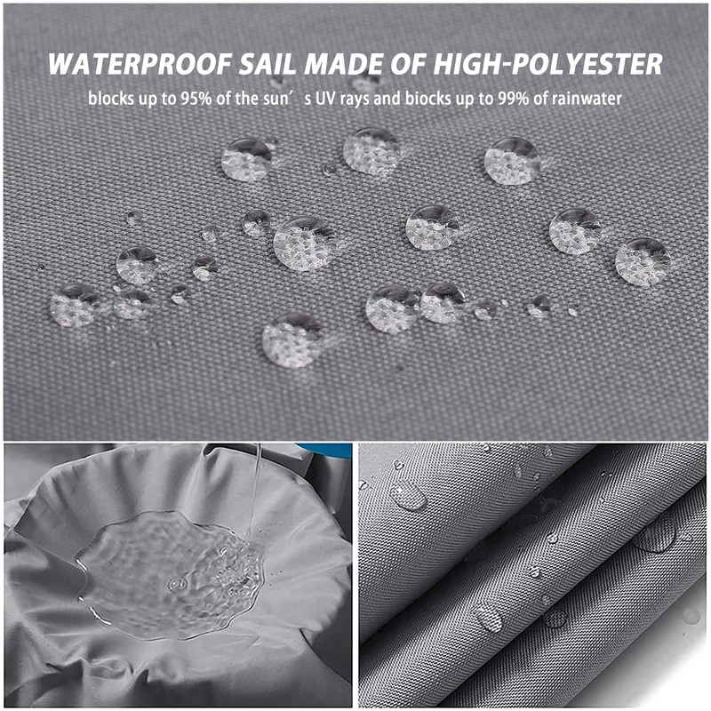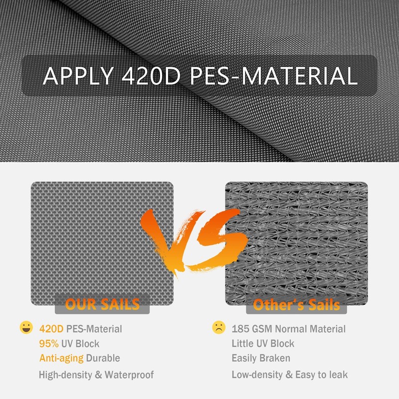 - Easy to install: with robust stainless steel D-rings on each corner, and 1 free 1.5 m ropes, the sail is easy and quick to assemble (the curved sides to improve tensile strength and prevent drooping)
