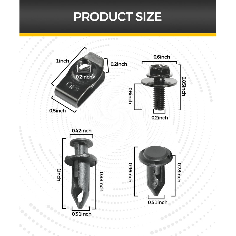 - [Easy to Use]: The car fender bolt screw kit is simple to use and adopts a push-in design, which is easy to install and remove, saving time and energy to replace the fixing clip.