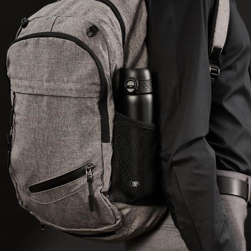 ION8 Steel Water Bottle, 600 ml/20 oz, Leak Proof, Easy to Open, Secure Lock, Dishwasher Safe, Hygienic Flip Cover, Fits Cup Holders, Carry Handle, Durable, Scratch Resistant, Carbon Neutral, Black