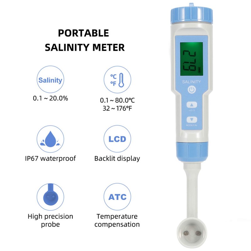 - Suitable for the detection of salt content in freshwater aquaculture, freshwater aquarium, marine aquaculture, seawater aquarium, seawater, brine, soup, and liquid food.