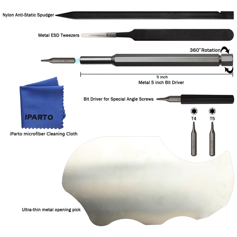 - 【What you Get】2 x Joystick Replacement, 2 x Joystick Cap Replacement, 6 x thumbstick grip cover(2 black,2 white,2 blue), 1 x Metal 5 inch Torx T5 Security Screwdriver, 1 x 2 inch Torx T4 Security Screwdriver(for special angle screws), 1 x Metal ESD Tweezers, 1 x Ultra-thin metal opening pick, 1 x Nylon Anti-Static Spudger, 1 x iParto microfiber Cleaning Cloth.