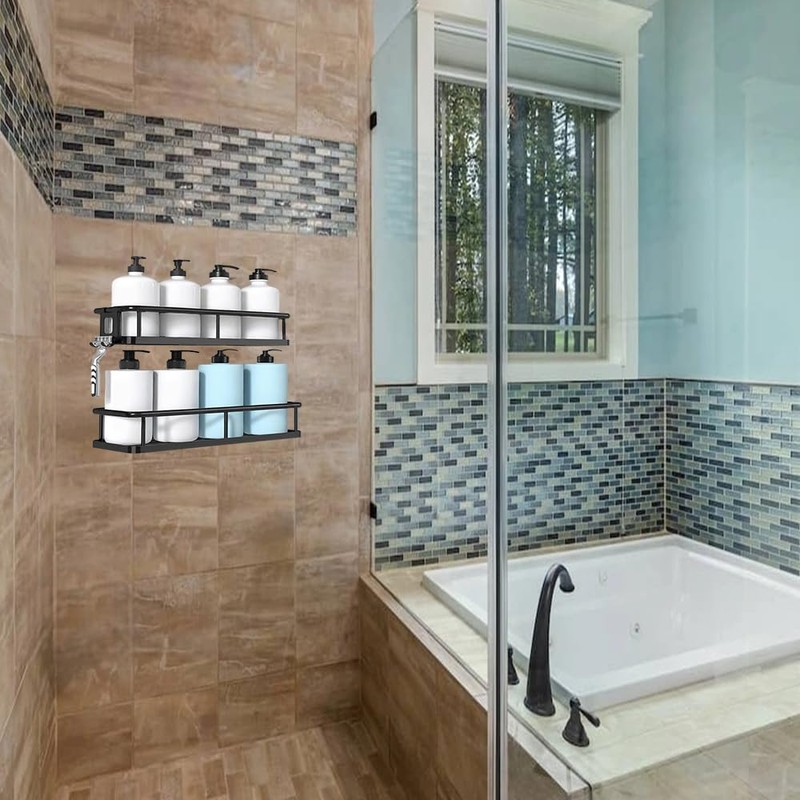 ipow 2er Set Duschablage ohne Bohren Badezimmer Organizer Duschregal ohne Bohren Duschhalterung für Shampoo Duschkorb Badregal mit 4 Abnehmbaren Haken Schwarz Duschablage für Dusche