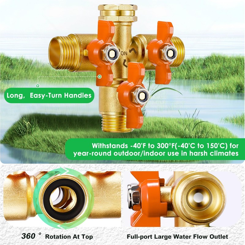 • 【Easy Installation without Tools in Several Seconds】IPOW 3 way water hose splitter is super easy to connect and disconnect. Covered with thermoplastic rubber for easy grip and operation, the valves on the brass hose y splitter allow you to control the flow separately and easily without going back and forth to the source.
