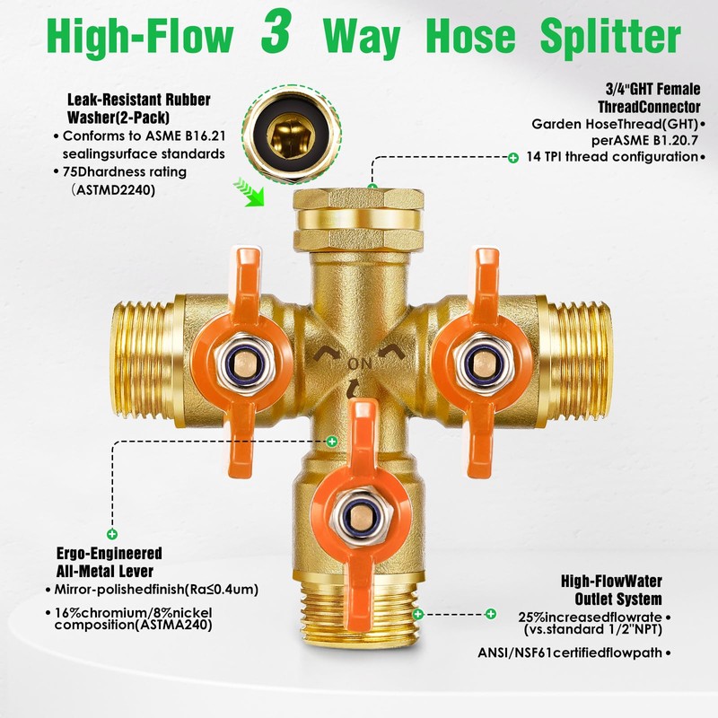 • 【Full Port High Flow Large Diameter 3 Way Hose Splitter】IPOW 3 way garden hose splitter provides twice the water flow of a regular garden separator because it comes with a full port hose adapter. Larger water inlet design allow for a higher water flow rate, maximizing efficiency.