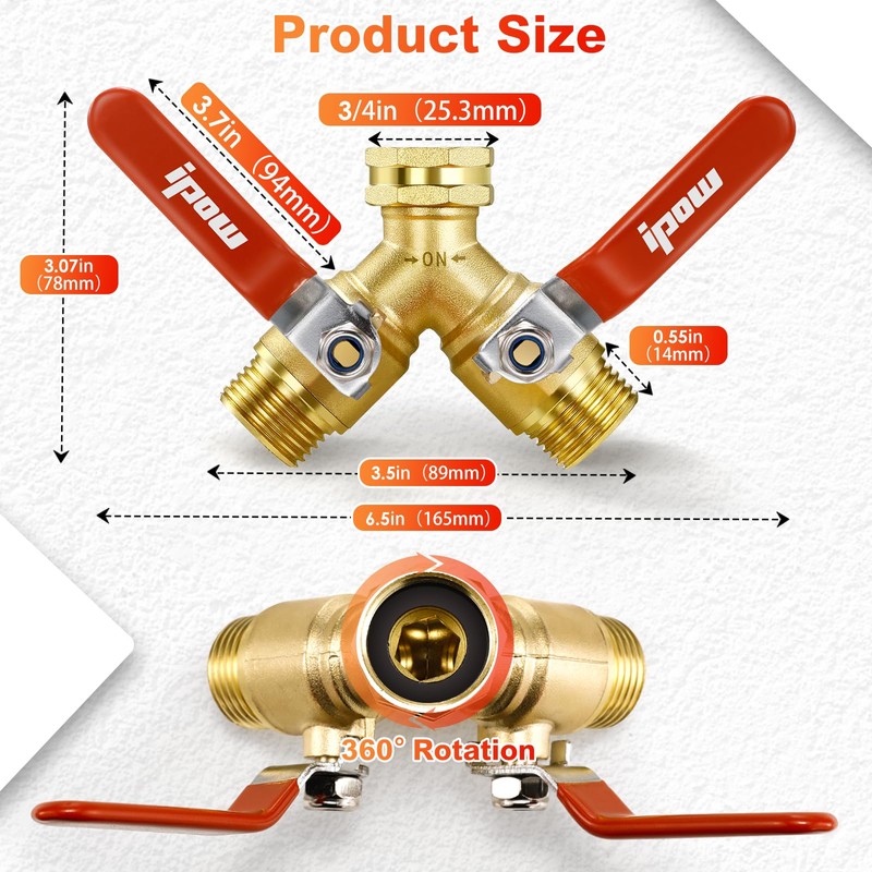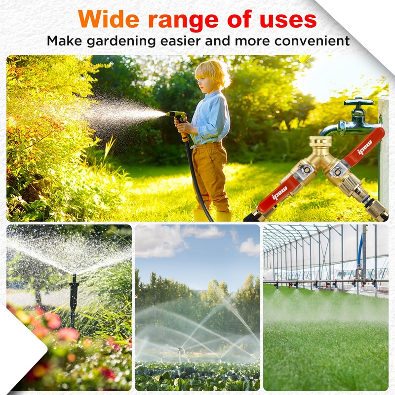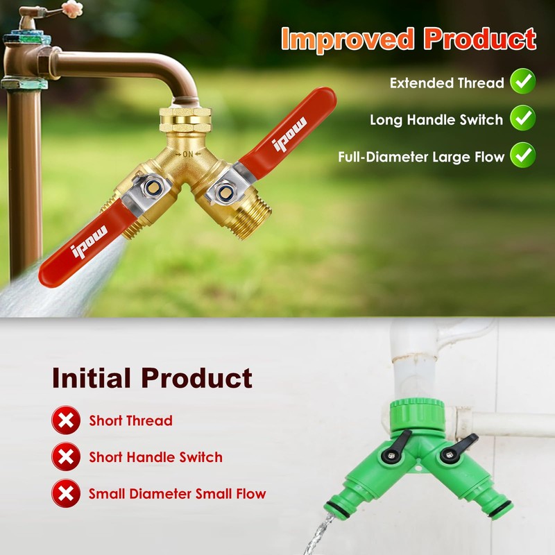 - Easy Installation without Tools in Several SecondsIPOW water hose splitter is super easy to connect and disconnect. Covered with thermoplastic rubber for easy grip and operation, the valves on the brass hose y splitter allow you to control the flow separately and easily without going back and forth to the source.