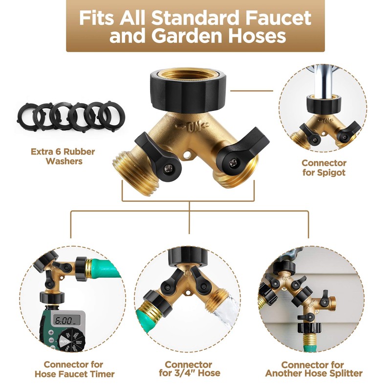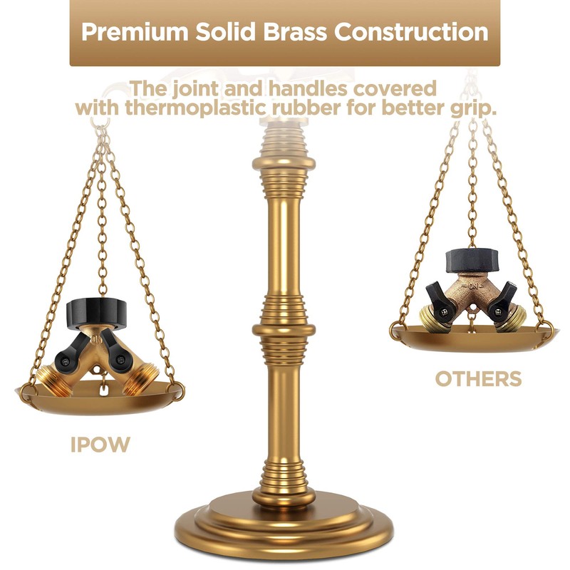 **About IPOW** We created IPOW with a single goal: Make the smart life easier. That means starting with affordable, high-quality products and ending with a commitment to 100% user satisfaction. We only sell products that we can use ourselves. After all, we're customers too. **100% Risk-Free Guarantee** If for some reason your purchase doesn't work or you are not satisfied with the product, please feel free to email us, we are committed to 100% satisfaction for our customers. **Product Features** 1\. Made of 1 piece of solid brass (don't settle for cheap plastic or low- grade brass imitations). 2\. Run 2 or even 4 hoses from 1 spigot (to run 4 hoses, you'll need 3 connectors). 3\. Connect 2 hoses to your backyard sink, drip irrigation, sprinkler timer system, hose end tap timer. 4\. Use the individual valve to control flow separately & easily. 5\. Valves are made of brass (not plastic) covered with thermoplastic rubber for comfort when turning on or off. **Warning** : This product contains a trace amount of lead (all solid brass products do) and is intended for home outdoor use only. Not for commercial applications. **Package Content** 1 x 2 way hose connector 6 x rubber washer