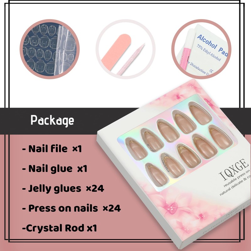 - 【Package Included】The press on nails kit comes with 24pcs fake nails of different sizes, 24 sheets of jelly glue stickers, 1 nail glue, 1 crystal rod and 1 nail file. Jelly glue can last for several days, allowing the fake nails to be reused, while glue is more durable. (Choose the right glue according to your own situation)