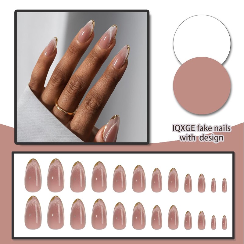 IQXGE Medium Almond Press on Nails French Tip Full Cover False Fake Nails Press ons Cat Eye Stick on Nail Gold French Tips Nude Glitter Acrylic Fake Nail Shiny Artificial 24Pcs Reusable for Women