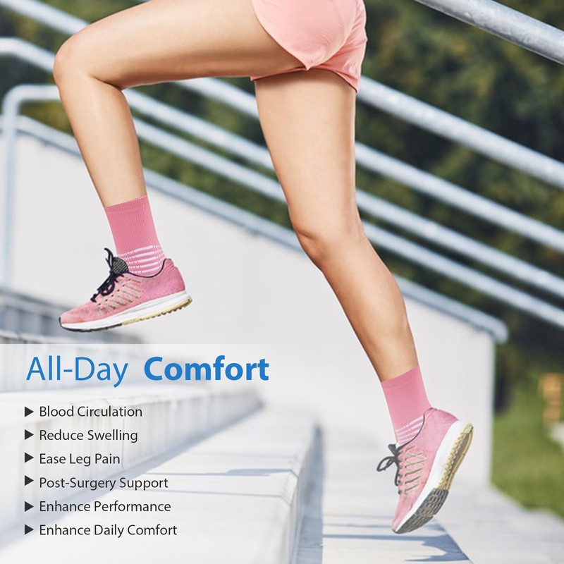- Targeted Ankle Support:The crew compression socks features 6 ankle compression rings delivering firm yet comfortable support. Perfect as ankle compression socks for women and men, this design helps stabilize your ankle during running, workouts, or long days on your feet, reducing injury risk.