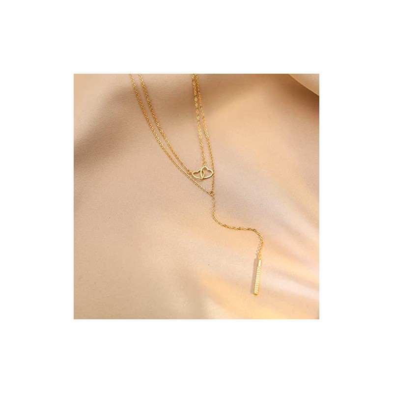 Iraveno Dainty Layered Y Necklace,Interlocked Heart Necklace for Women,CZ Bar Pendant Drop Y Necklace,Layering Lariat Necklace,18K Gold Plated