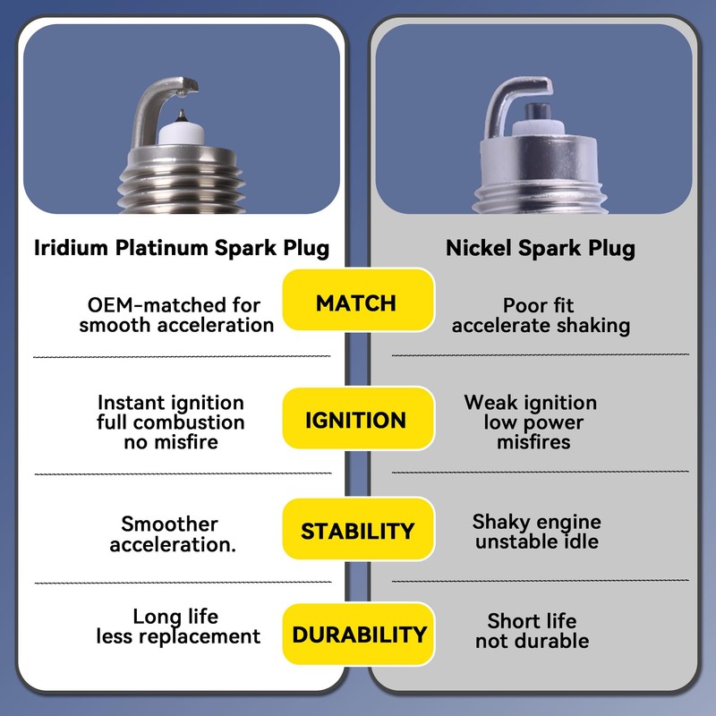 • 【Efficient & Durable】Fine Iridium tip provide excellent conductivity to generate strong and stable sparks. This ensures complete fuel combustion, improving engine efficiency, reducing fuel consumption, and minimizing carbon buildup for extended engine life.