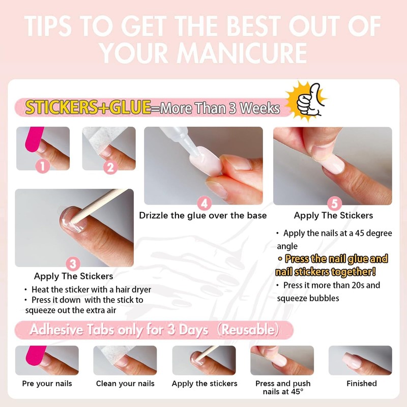 3. High quality: our stick on false nails are made of high quality ABS material. After several improvements, we have chosen the ideal radius and thickness to ensure a natural look and maximum comfort. These false nails provide a perfect manicure experience