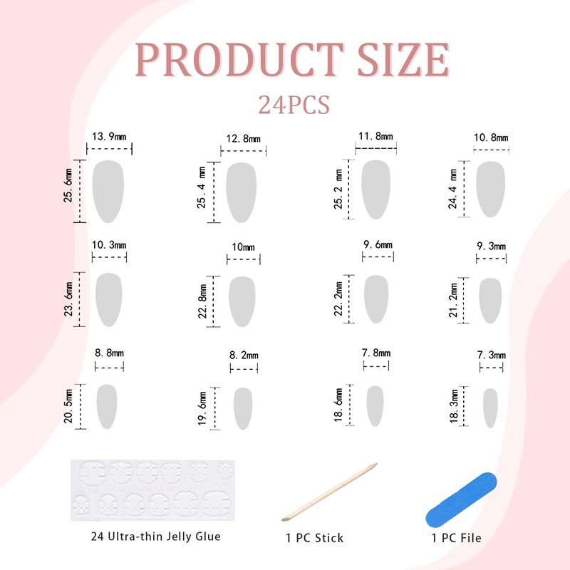 - Package contents: you will receive 24 pieces false nails in 12 sizes, 1 nail file, 24 jelly adhesive stickers and 1 wooden stick for removing the nails. These practical tools allow for easy and quick application, so you can style your nails perfectly in minutes