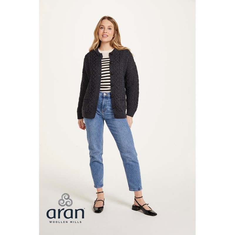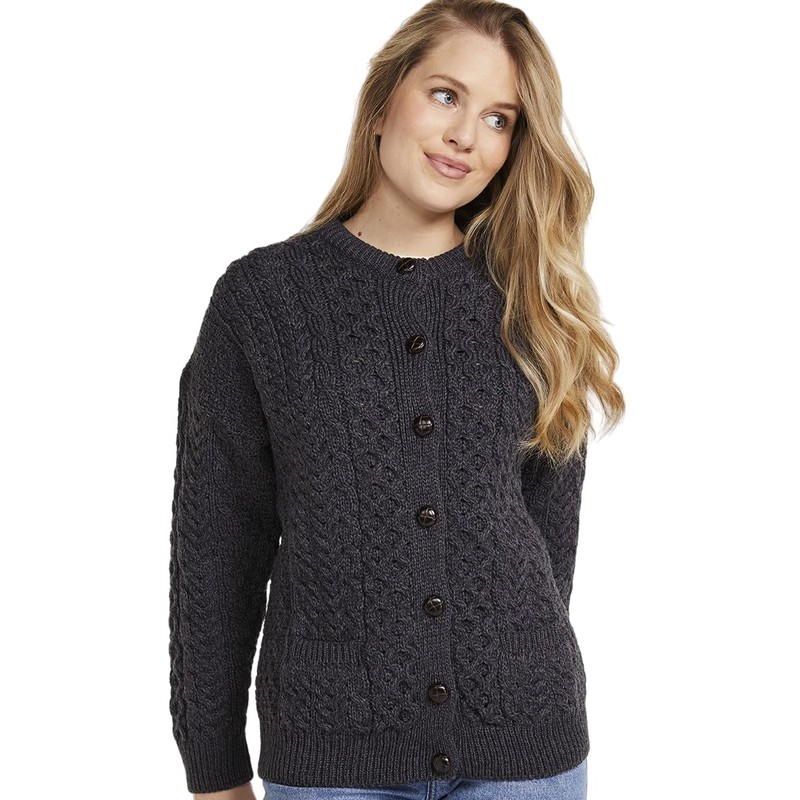• IRISH CARDIGAN: Keep warm with this Irish wool cardigan from Aran Woollen Mills, inspired by classic Aran knitwear. This knit sweater features three patterns of traditional stitching: honeycomb, trellis & Moss. It has a stylish rounded neckline and low collar, a ribbed hem finish, and dark wood buttons. Add a piece of Ireland to your wardrobe with this timeless, handmade cardigan
