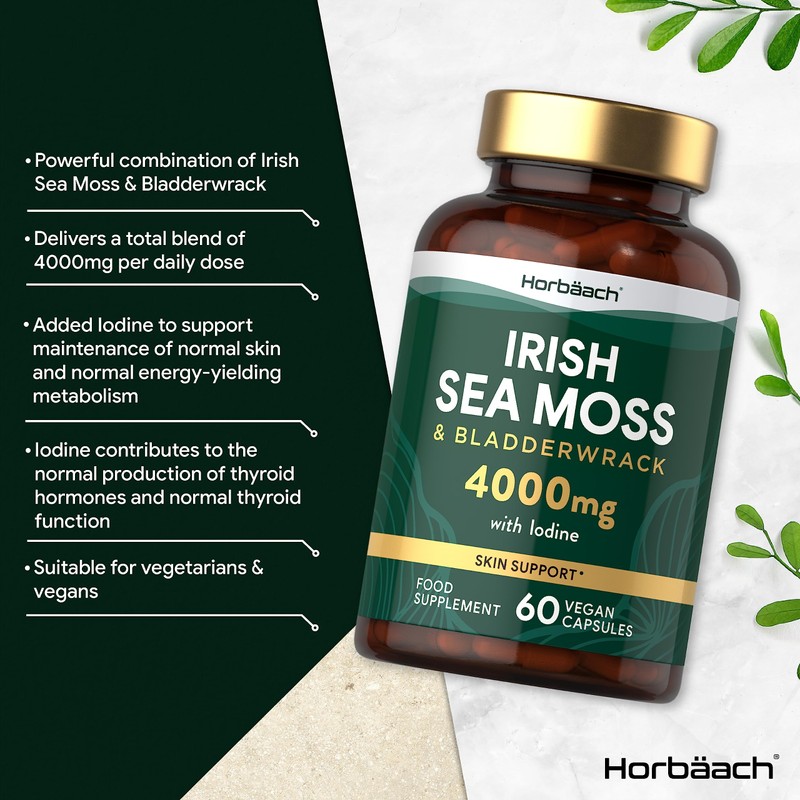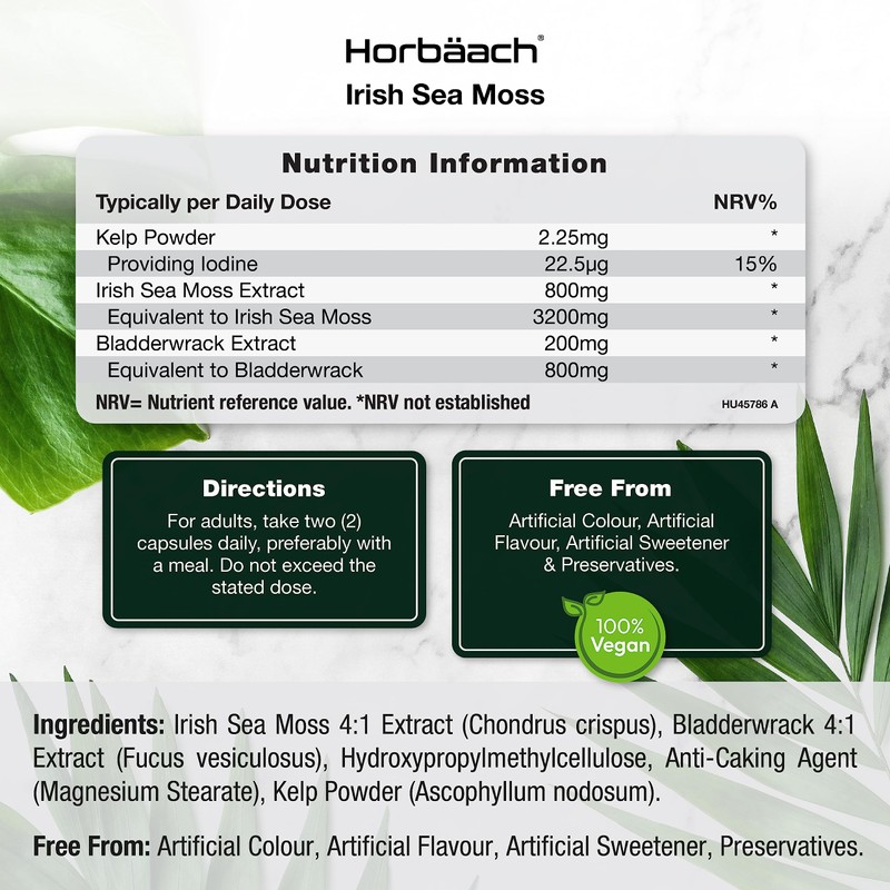 • SUITABLE FOR: Horbaach Irish Seam Moss & Bladderwrack capsules are vegan and vegetarian friendly, and contain no artificial colours or preservatives. The perfect formula for adult men and women at the best value.