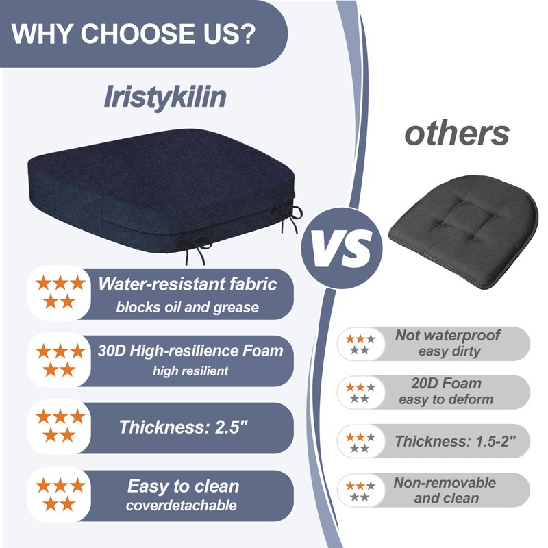 - 【Ultimate Comfort & Support】: Chair pads are made of 2.5" thickened and 30D high resilience foam with extraordinary softness and support, compared to other dining room chair pads our foam thickness is 1" thicker than other cushions and the foam resilience is stronger. Dining room chair cushions not only provide you with a comfortable sitting feeling to protect your tailbone and reduce the pressure on your body. It can also keep the shape for a long time, not easy to deform.