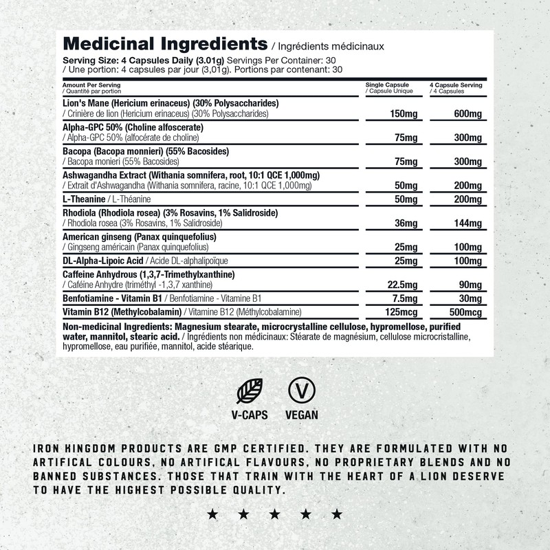 - 600mg LION'S MANE: Lion's Mane is a potent mushroom which helps with stimulation of Brain Nerve Growth Factor (NGF). NGF are unique proteins that aid in the growth, development and regeneration of nerves and neurons that can help to improve concentration, memory, mood and reduce brain fog.