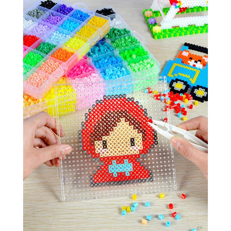 - 24 colours ironing beads set: a total of 7300 5 mm ironing beads in 24 colours, 6 bead plates (heart, square, hexagon, circle, seven-sided flower, small hexagonal star), 1500 white refills for beads, 1500 black refills for beads, 3 pieces ironing paper, 1 white tweezers, 3 hair clips, 2 ironing rings, 6 cords, 4 Keyring, 12 Sheets of tracing paper, 1 headband and 1 storage box, use a variety of fun accessories to create more creative artwork.