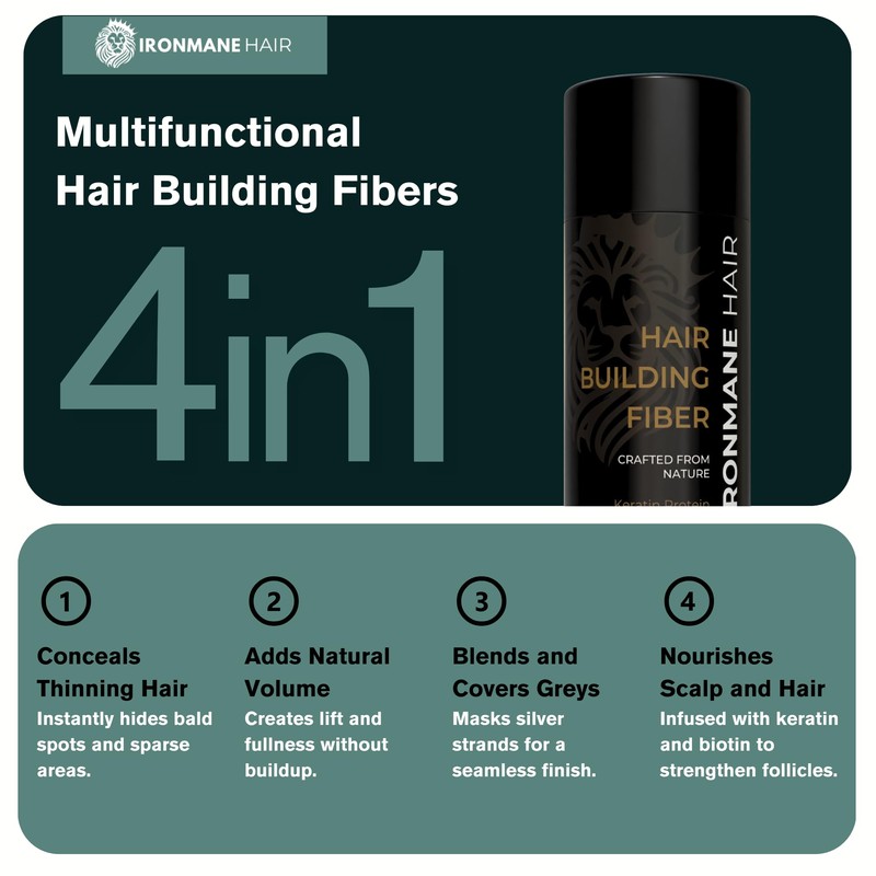 While other hair fibers rely on chemical additives and cotton-based formulas that don’t bond well, IRONMANE takes a different approach. Our formula is powered by just five natural ingredients, including pure keratin protein - the same building blocks as your natural hair. Keratin fibers lock onto your existing hair through static energy, creating a secure, natural-looking thickness. But we didn’t stop there. We infused Biotin, a powerhouse vitamin known for supporting hair strength, thickness, and scalp health.
