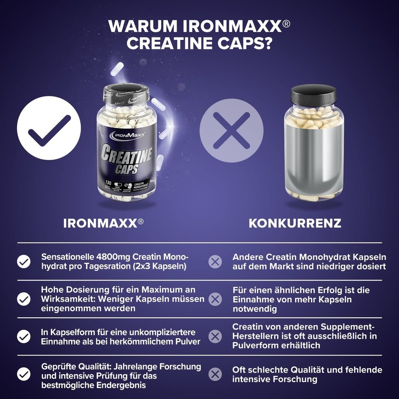 IronMaxx Creatine Caps - 130 Kapseln | 4800mg Creatin Monohydrat pro Tagesration | gluten- und zuckerfrei