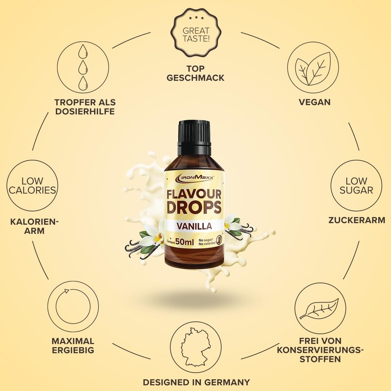 - Box contents: 1 x 50 ml IronMaxx flavour drops, vanilla