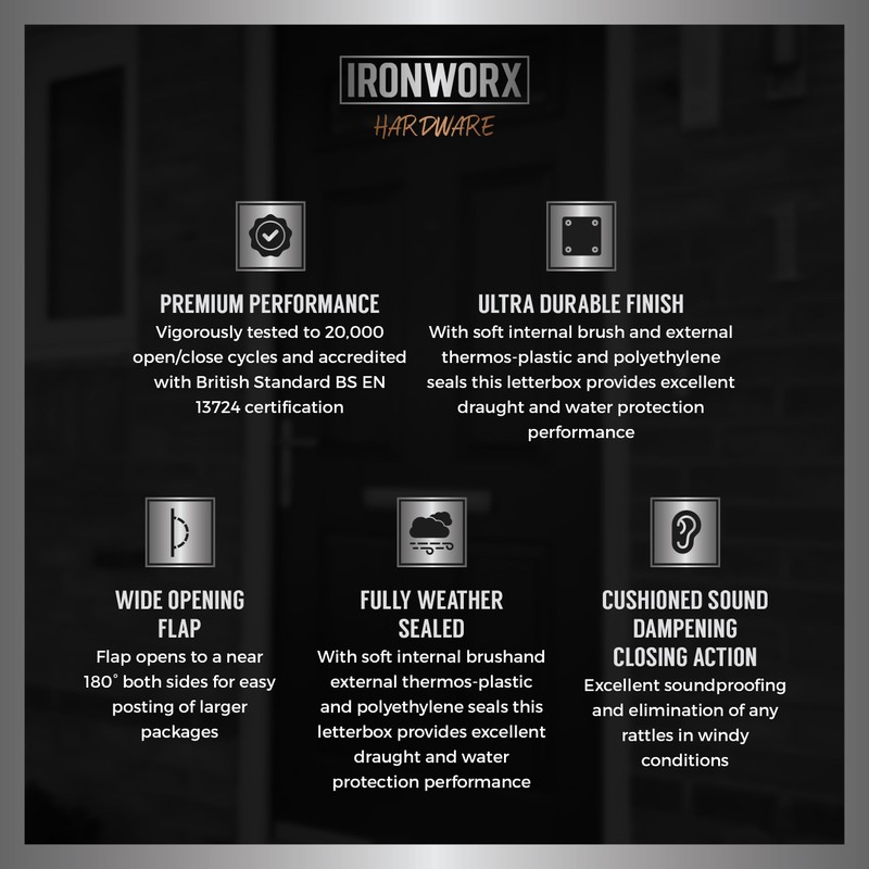 - SUPERIOR QUALITY - We’re passionate about the quality of our hardware here at IronWorx. That’s why our Enigma letter boxes are ultra durable and vigorously tested to a minimum of 20,000 open/close cycles and over 480 hours salt spray testing. Plus, they’re accredited with British Standard BS EN 13724 Classification, undergo extreme weather performance with all colour finishes, and are accredited to BS EN 1670 Grade 5.
