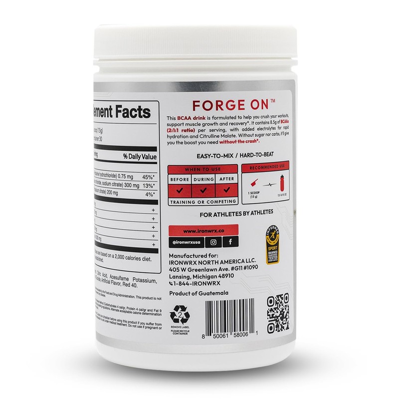 Help boost muscle growth and recovery with IRONWRX BCAA Drink Mix. - Contains a 2:1:1 ratio of leucine, valine, and isoleucine, along with L-glutamine and citrulline malate. - Helps replenish your body's amino acid stores. - Provides 8g of BCAAs per serving. - Contains 1,000mg of citrulline malate per serving to enhance blood flow and nutrient delivery. - Has 0g of carbs and 0g of sugar per serving. - Mix one scoop with 8-12 oz of water and shake well. Drink before or during your workouts for best results. - Third-party tested free of banned substances by Informed Sport.