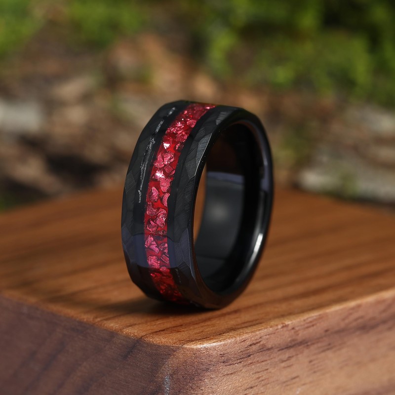 IRROYA 8mm Tungsten Rings for Men - Pure Black Band with Natural Ruby Unique Style Multi Faceted Black Band Men's Daily Wear/Wedding Wear Gift for Him, Non-Precious Metal, Ruby