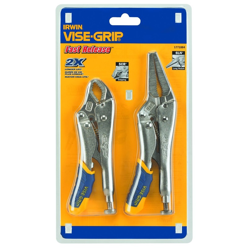 The Irwin Tools 1771884 VISE-GRIP 2-piece Fast Release Locking Pliers Set Contains: 6LN and 5CR. These two tools provide you with the versatility to do a lot of jobs. The 6LN is a Long Nose Plier that allows you to get into tight spaces and the 6-Inch length gives you the reach you need. The 5CR features Irwin's patented self energizing lower jaw on a curved jaw tool. The 5CR gives you 3x the gripping force of traditional curved jaw pliers and is ideal for gripping and turning. These locking tools are ideal for tightening, clamping, twisting and turning. Vise-Grips are constructed of high-grade heat-treated alloy steel for maximum toughness and durability and feature a lifetime guarantee.