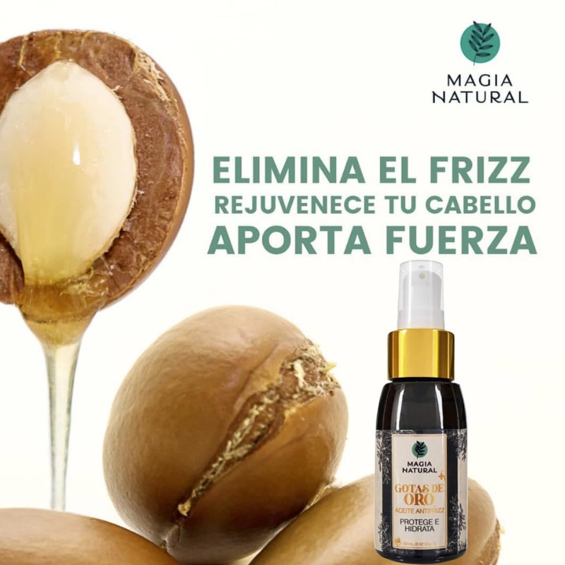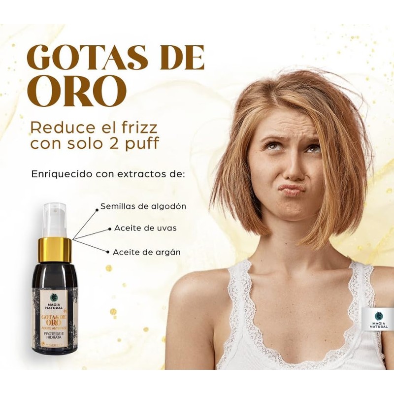 - Magia Natural Gold Drops Gotas de oro Antifrizz provide nutrients and antioxidants that strengthen your hair, improving its appearance and texture.