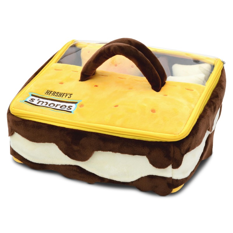 - This full-color, officially licensed pillow is comprised of a fleece zipper closure box shaped pillow with a clear window in the front to show the three smiling s'mores making buddies inside