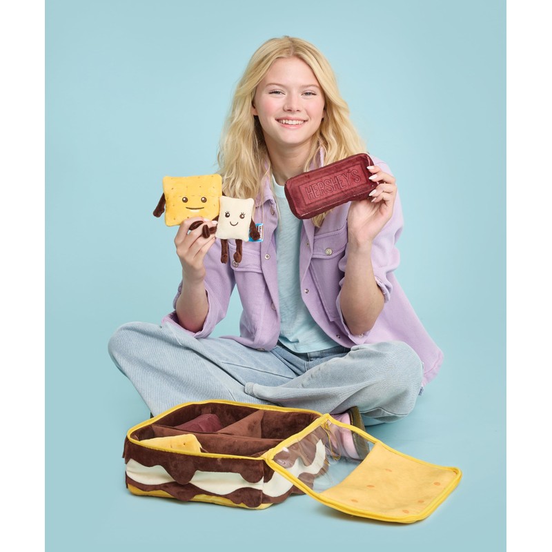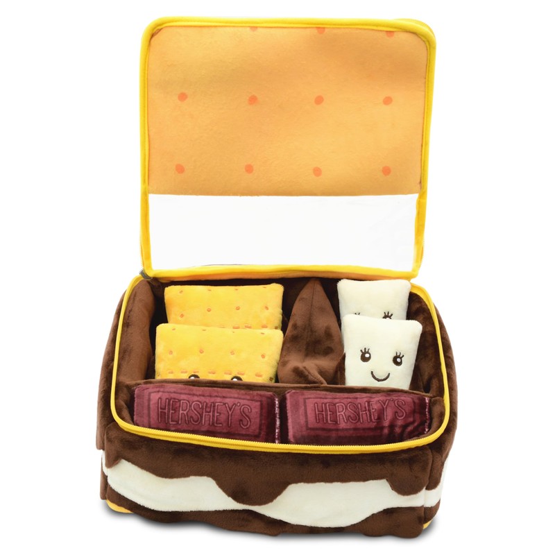 - Sizable pillow measures 11" wide x 11" high x 5" deep and includes 3 plushie s'mores making play pieces