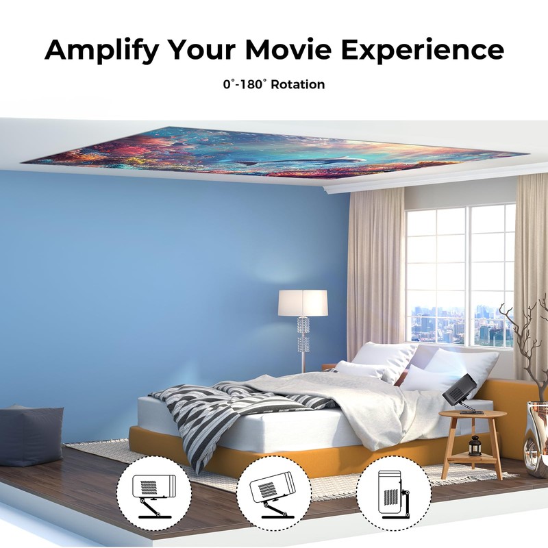 • Quick Setup: In just seconds, you can effortlessly mount the projector on its portable stand, adjust it to the perfect angle, and dive into your favorite movies or sports events.