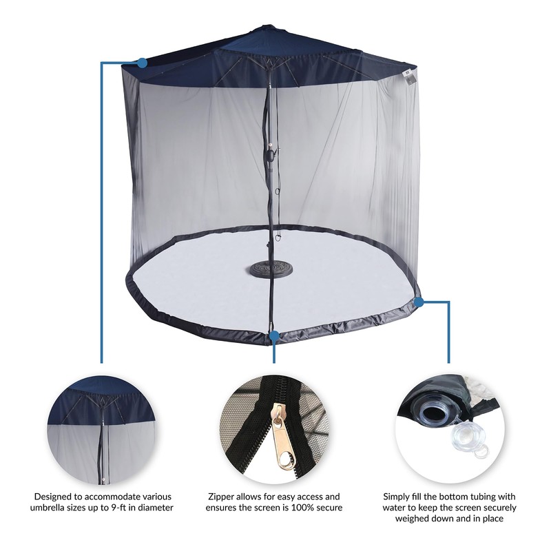 - PEST PROTECTION - The 9-ft screen is made with a thin, breathable polyester netting to keep pesky insects out of the umbrella area. Simply fill the bottom tubing with water to keep the screen securely weighed down and in place.