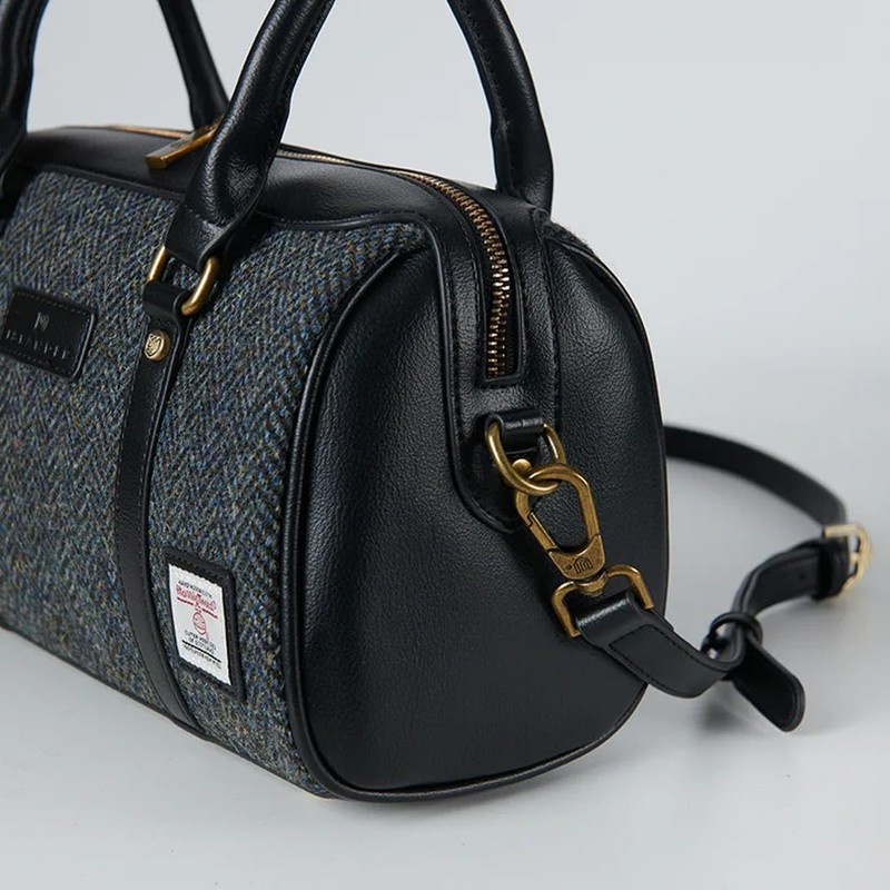 Islander The Medium Duffel Harris Tweed & Microfibre Leather (Black and Grey Herringbone)