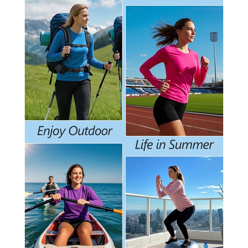 5. The crew neck and longer hem design of the hiking shirt for women make you unrestrained when wearing it as an undershirt or sweatshirt, it is very suitable for rashguard, swimming, hiking, running, cycling travel and a variety of outdoor activities