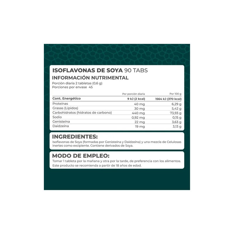 90 tabletas de isoflavonas de soya formadas por genisteína y daidzeína.