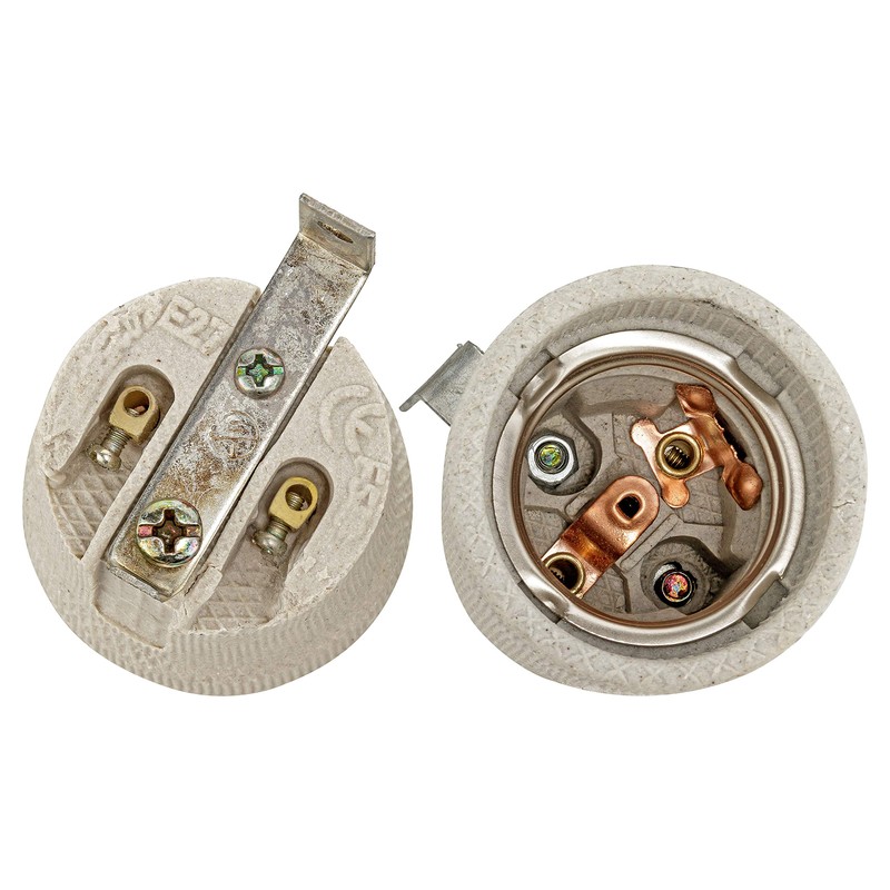 Technische Informationen: Sockel E27 Einteilig Material: Porzellan / Keramik Farbe: Grau Nennwert: 4A/250V Druckfeder unter Mittelkontakt Befestigung: mit Metallwinkel Gewicht: 61 g