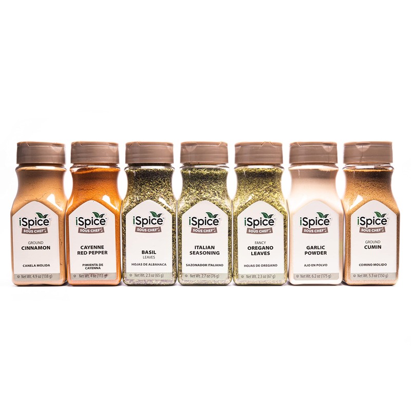 iSpice Spice Set with Spices Included Basil, cayenne, cinnamon, cumin, garlic powder, italian seasoning, oregano Aromatic 7 pack.