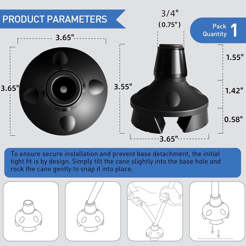 - 5S QUICK INSTALLATION - COMPATIBLE WITH 3/4 INCH CANES: This walking stick tips precisely designed for mainstream 3/4 inch canes (not compatible with wooden canes). No tools required—align, press, and rotate the cane to securely lock within 5 seconds. Internal anti-detachment structure guarantees a firm, rattle-free connection