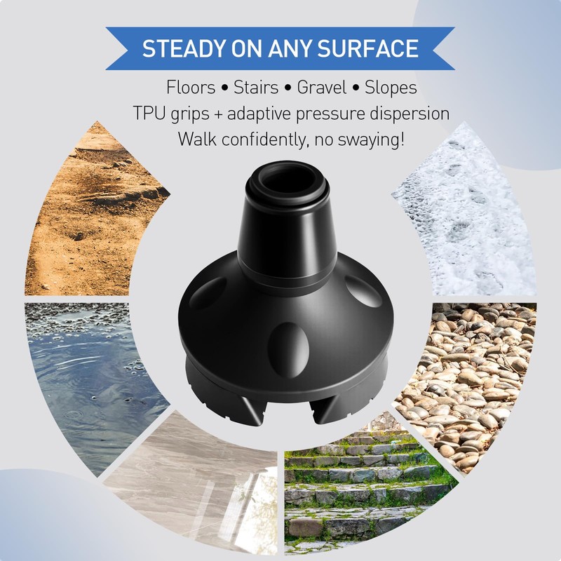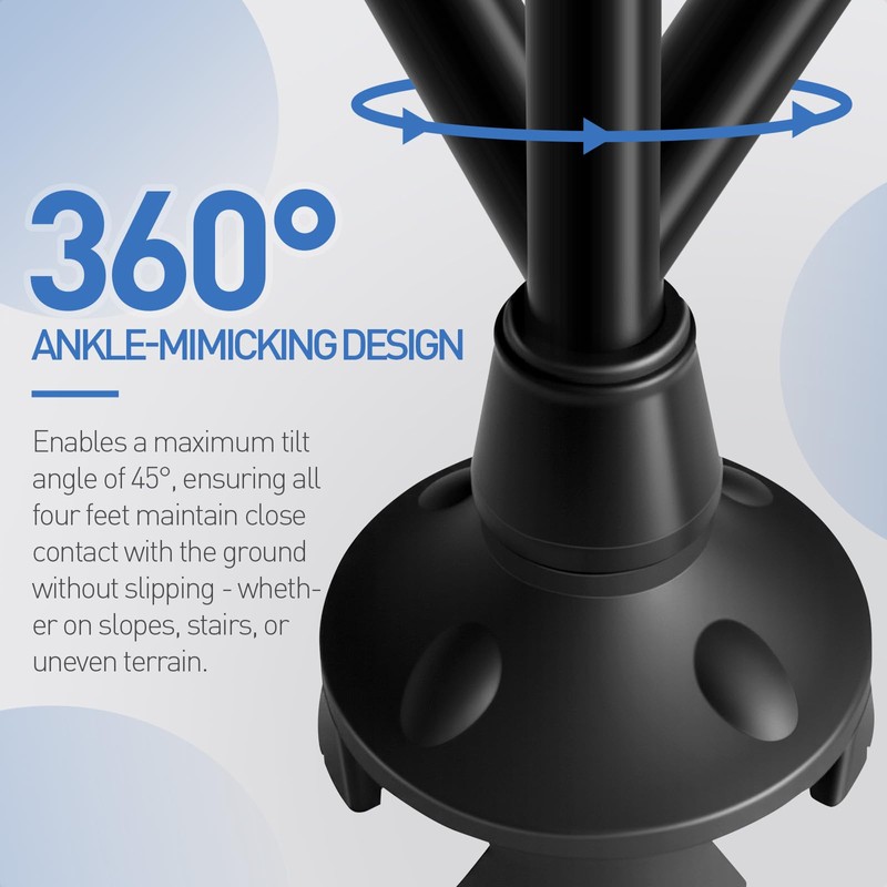 - STABLE ON STAIRS & SLOPES - 360° OMNI-DIRECTIONAL BIONIC ANKLE JOINT : The walking stick tip features a 360° omni-directional bionic ankle joint. Whether ascending/descending stairs, slopes, or uneven terrain, it automatically adjusts the 4 prong base angle to maintain full ground contact. This completely resolves the instability and slipping issues of conventional bases, delivering step-by-step stability