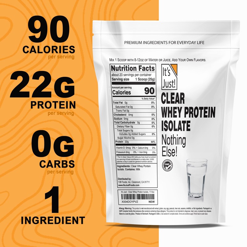 It's Just - Clear Whey Isolate, WPI-90, Zero Carb Protein Powder, 20 Servings, No Added Flavors, Product of Denmark, Packaged in USA, Ultra Premium, 17.6oz (500g)