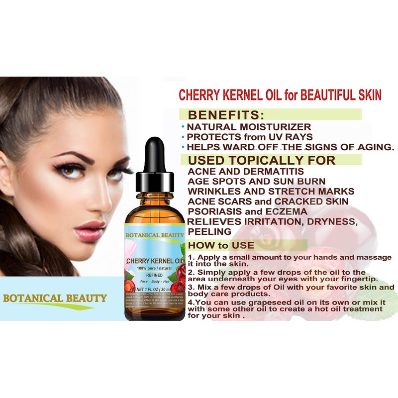 CHERRY KERNEL OIL is currently considered to be the best oil for natural, anti-aging skin care products with restorative properties for all skin types, especially for dry or mature aging skin, chapped and cracked skin, balances the moisture in the skin, and leaving skin soft and smooth.Botanical Beauty Italian CHERRY KERNEL OIL is excellent for use after exposure to the sun.