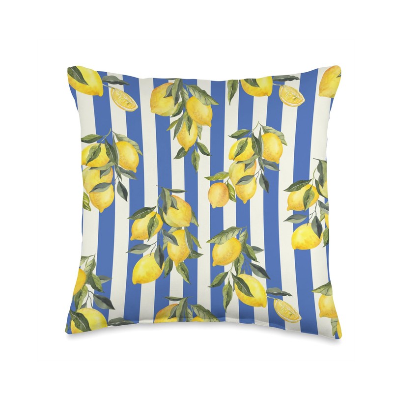 Italian Coast Lemons On Blue Stripes Summer Fruit Pattern Throw Pillow